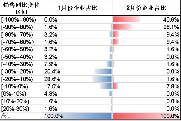 受疫情影响,2020年1-2月餐饮企业的营业额和净利润大幅下滑。从表2中可看出,样本企业1月份销售额同比下滑集中在0-30%;2月份样本企业销售额同比下降集中在80-100%。